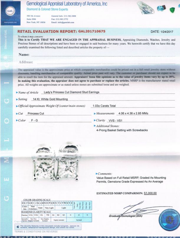 Don't miss the opportunity to own this dazzling pair of 1.03 ctw princess cut diamond stud earrings.These earrings were graded by GAL Labs as a Natural Earth Mined Diamond, F-G color, VVS2-VS1 clarity, Very Good polish, very Good symmetry and no fluorescence. These diamond stud earrings are a show stopper and will look perfect with any outfit. These diamond stud earrings are the perfect way to say I love you and remind that special someone that they have your heart. These princess cut diamond stud earrings has so much sparkle, fire and brilliance!