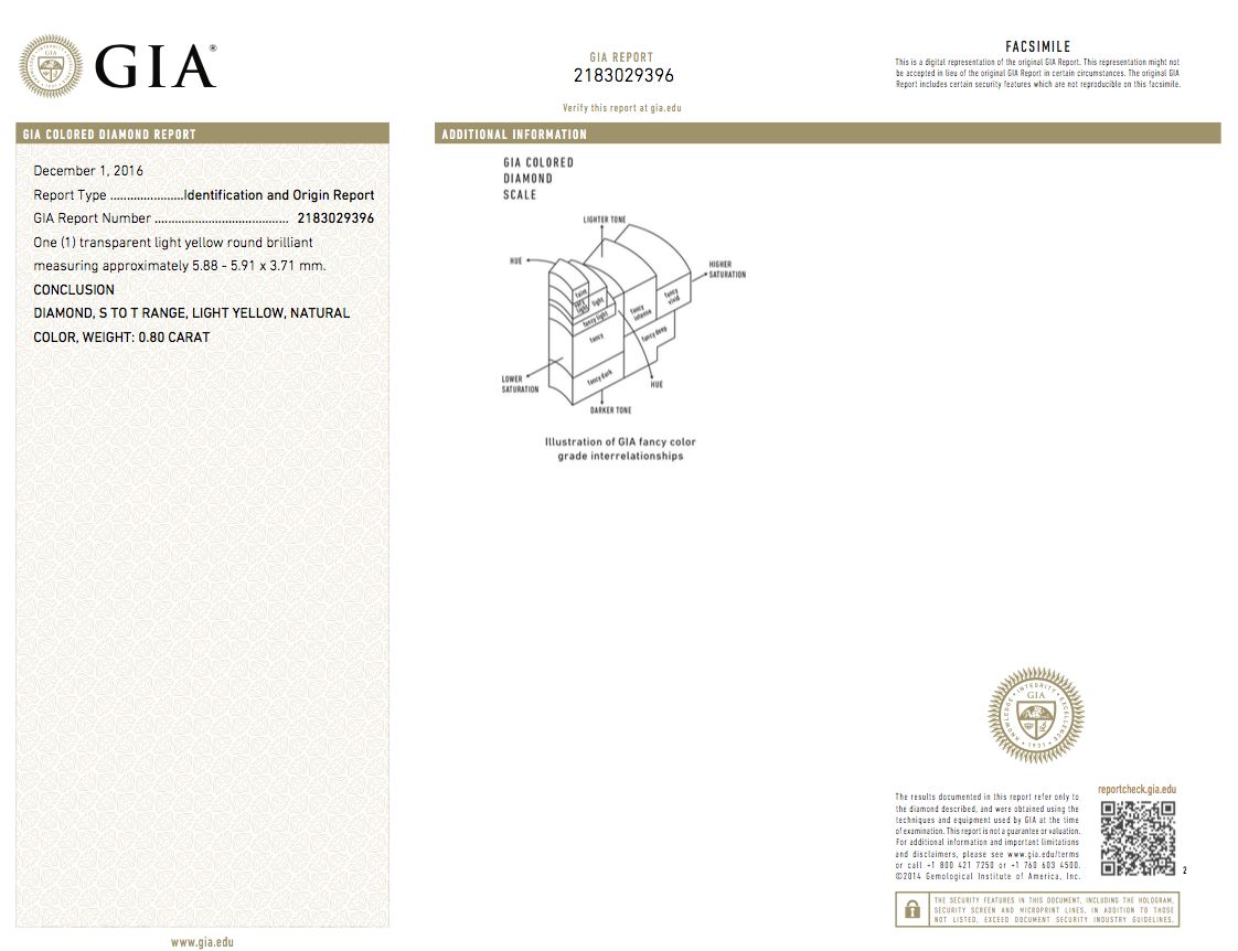 This diamond was graded by GIA Labs as a Natural Earth Mined Diamond, S-T yellow color, VVS2 clarity.