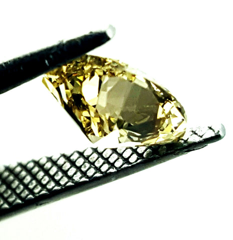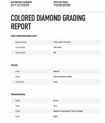 This diamond was graded by GIA Labs as a Natural Earth Mined Diamond, Fancy Brownish Yellow color, SI2 clarity, Good polish, Fair symmetry and faint fluorescence.