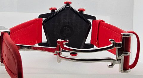This Swiss-made quartz watch has a water resistance of 30m and comes with its original box and packaging. The stainless steel band Red Polyurethane Strap 24mm and red bezel add a touch of elegance to this unisex adults' wristwatch, making it a rare and coveted piece for watch enthusiasts. this watch is a stylish and functional accessory for any luxury watch collection.