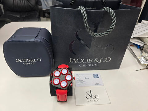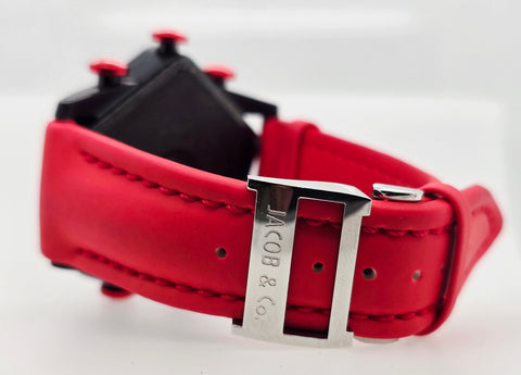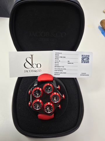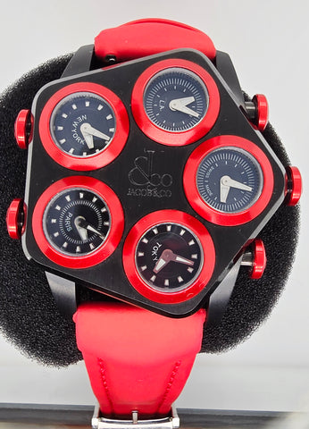 RARE Jacob & Co Ghost Grand Watch is a luxurious timepiece featuring a unique five time zone design with a striking red color.